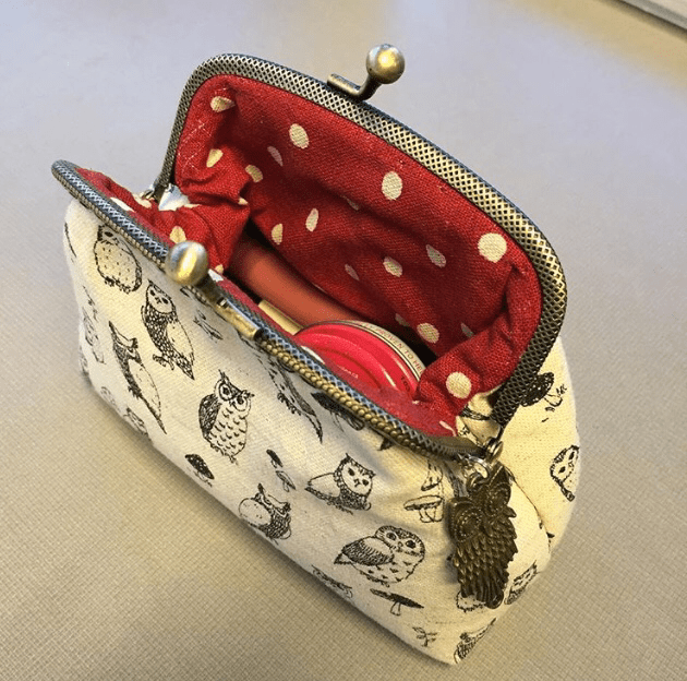 Now for the clasp purse assembly. I’ve never made a clasp purse, so I thought I’d make tester. What fun! My little tester purse turned out just beautifully! I found some lovely owl fabric and some sweet red mochi dot fabric for the lining. A little soft and stable, and zip, zip, zip on my sewing machine – DONE!