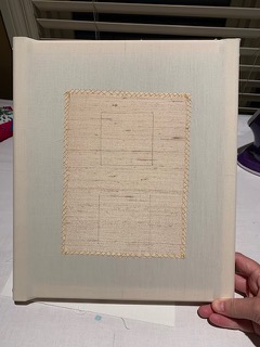 I’ve made some decisions for my journals… and I feel pretty good about them! As I mentioned in the first video, I am planning at least 3 journals. But where to start? Making a decision is the hardest thing to do. So, I have decided to start with a single page. I am enrolled in Sew by Hand’s (Natalie Dupuis) “Humbly Magnificent Couching Stitch” and I will be using the stitch samples as pages in my goldwork book. This is a perfect solution for me as I can manage the coursework and building the journal pages at the same time. The gold work class has also helped me decide what the page size and layout will be and has made it very easy for me to get started. I am keeping the page size consistent with the journal template I created (my silk fabric is 6” x 8” and will be trimmed to size later). Here’s my first page all framed and ready to be stitched!