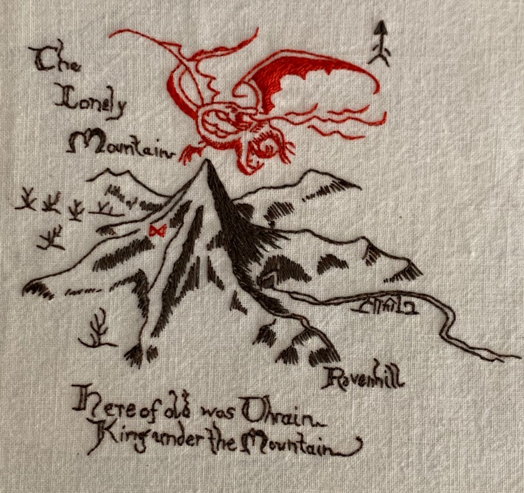 There are a few different versions of the map on the web, but I was drawn to this version. I love how Smaug stands out in red. I also wanted to add some of the words and annotations from the map into my piece. I transferred the design to fabric using a light pad and brown micron pen (003).