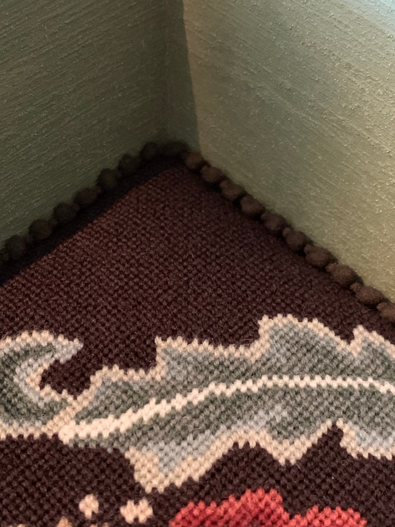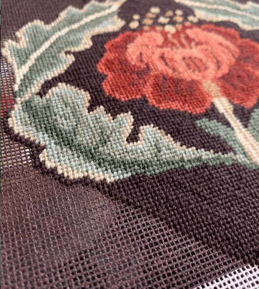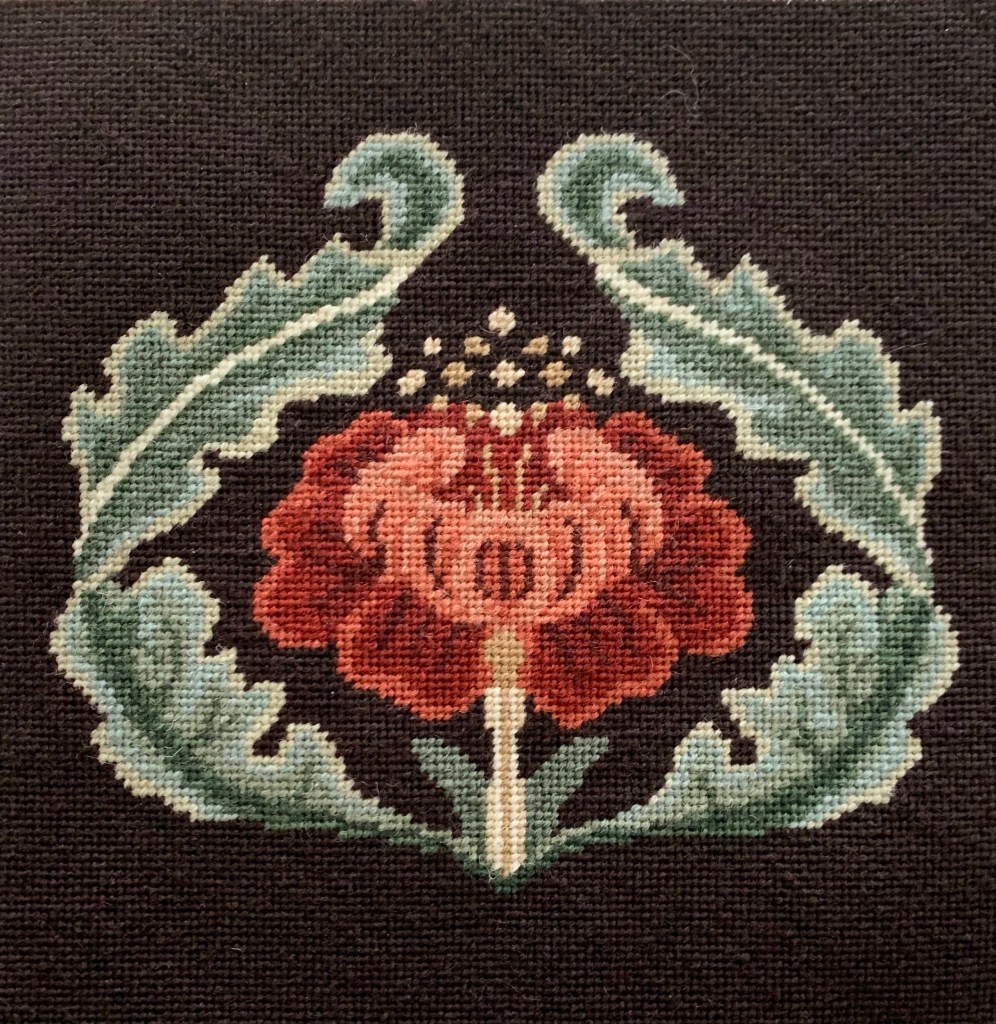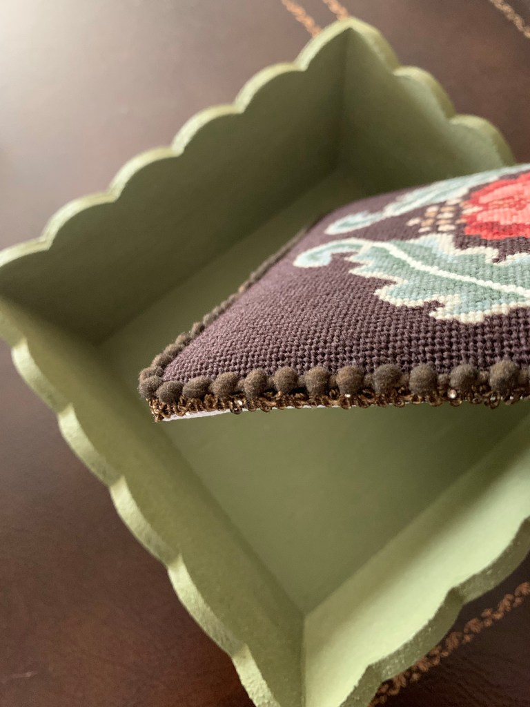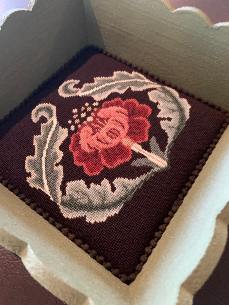 Another sweet little “no-sew” tray has come into existence! I finished this beautiful William Morris Rose needlepoint some time ago and just could not decide how I wanted to finish it. I was inspired by my “A Garden Queen” accessory tray and an awesome craft paint find in the sale bin at our local Michael’s store.