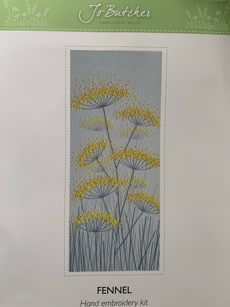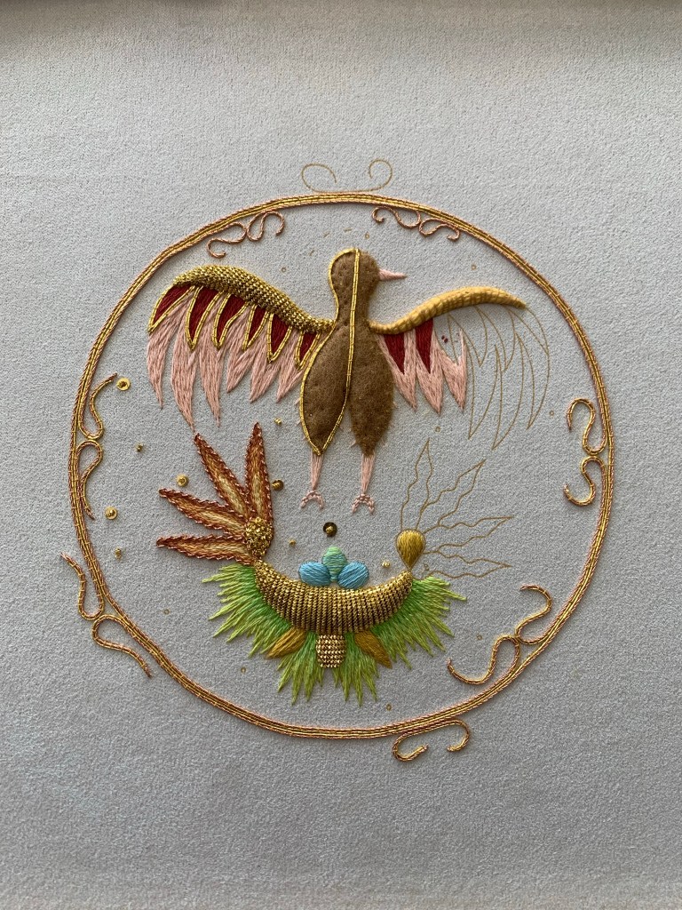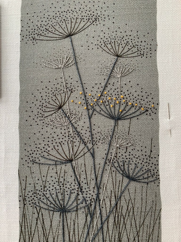 Jo has been one of my favourite designers for quite some time! When I saw this workshop, I knew it was the right one for me. I love the french knots in soft yellows and the painted fabric and grey stems and grass. Such a lovely soft piece – and a delight to stitch. I’ll be very good at french knots when this is done!