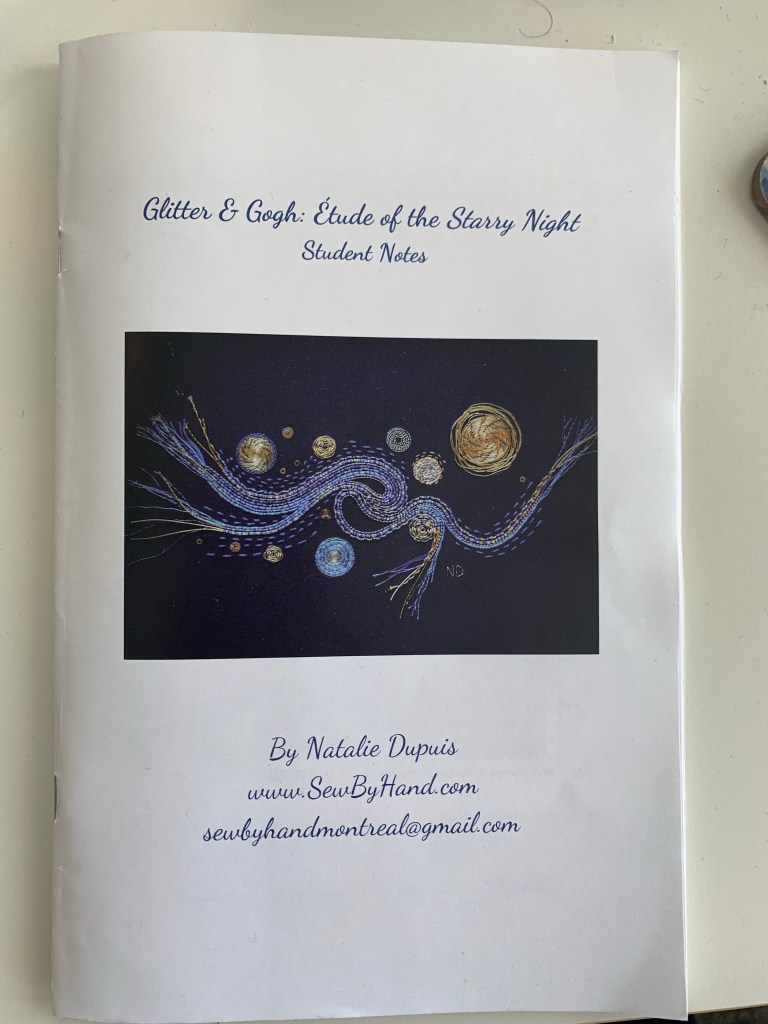 After waiting for over a year, our guild was finally able to run the Glitter & Gogh workshop with Natalie Dupuis! We had 18 students participate in this 2 day class over Zoom (we had 6 hours of instruction on two consecutive Saturdays). This piece was inspired by Vincent’s “Starry Night”. Natalie’s design has been a delight to stitch – there are many different types of gold materials – including an element with gold leaf.