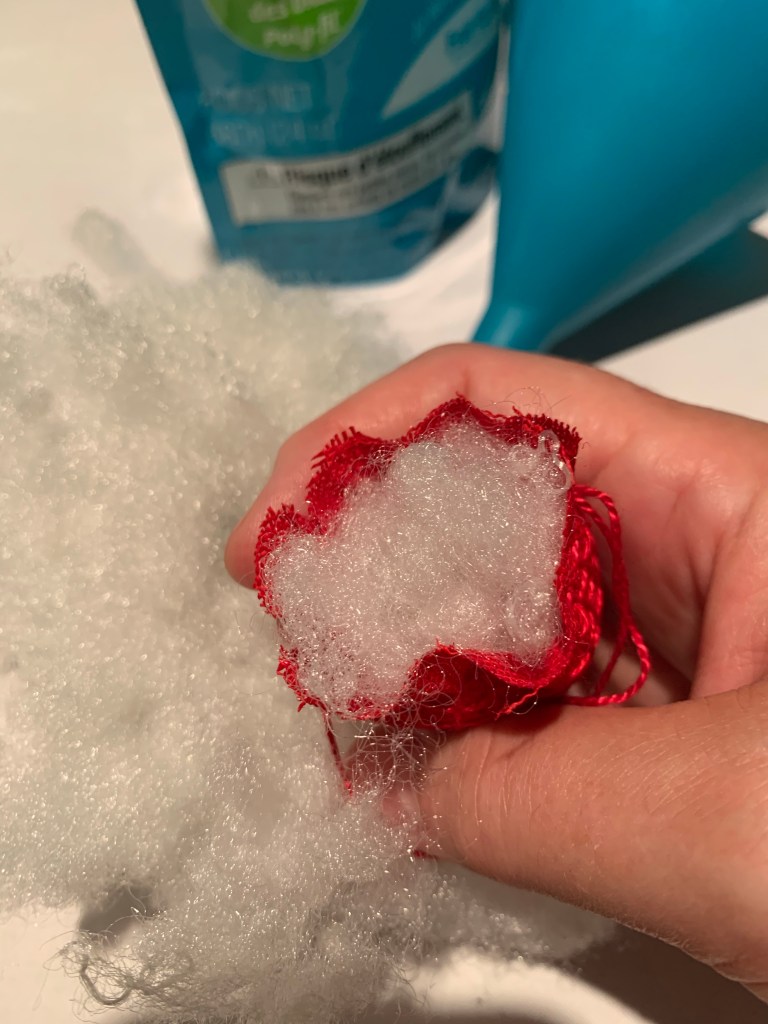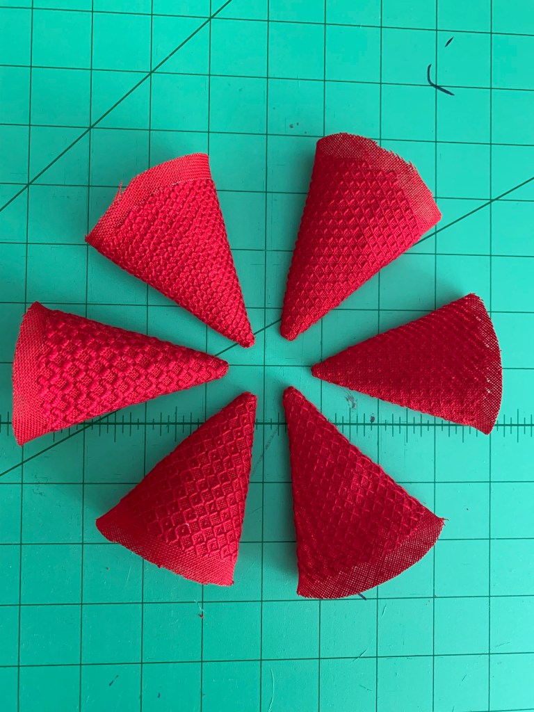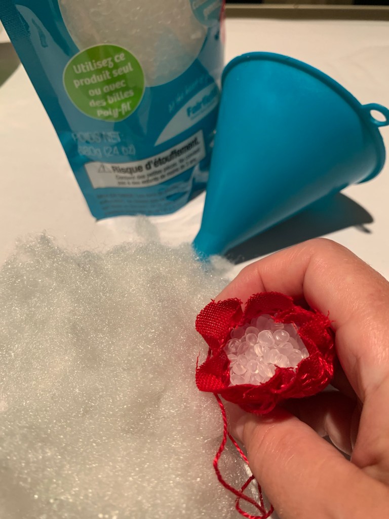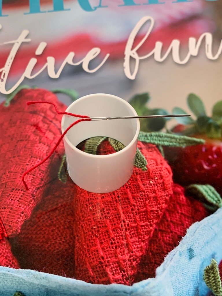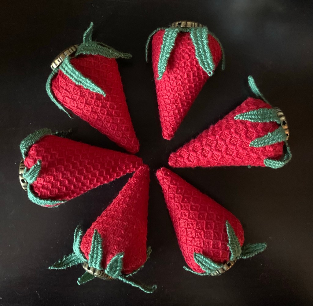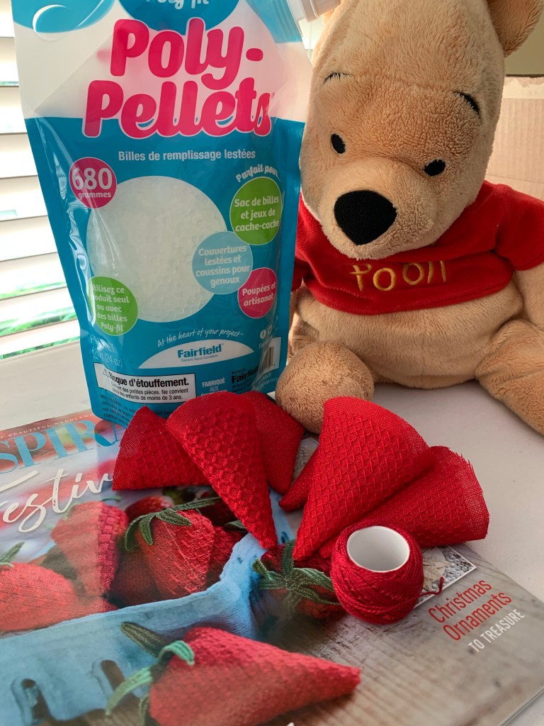 Find the template in your instructions. Trace it out onto a piece of freezer paper and cut out. Lay the freezer paper (waxy side down) onto the back side of the strawberry. Press gently with an iron (no steam) so that the freezer paper becomes affixed to the fabric. Using a sharp pair of scissor trim the fabric allowing a 1/4” to 1/2” seam allowance. I like a larger allowance to allow for some fraying of the fabric (especially linen). Gently remove the freezer paper from the back. I used the same piece of freezer paper for all of six of my strawberries.All done! I will tidy the edges after I sew wthe long edge together. NOTE: if you are worried about fraying along the top rounded edge, you could zig-zag the raw edge. With right sides together, match and sew the straight edges of the strawberry together using tiny stitches. Make sure you secure each end well. You can do this either on a sewing machine or by hand, using small straight stitches. Trim your edge Carefully turn the berry right side out.Using a chop stick or pointy tool, push out the tip of the strawberry. Be very careful as you go as it is very easy to polk through the linen. Looking good!!Finger press the seam so that it lays flat. Trim the top edge of the berry. All of the berries are ready to be filled. There are a few options to consider for filling the strawberry. I am experimenting with Poly- Pellets for this project. You can also use walnut shells or fibre fill. Using perle cotton in a matching colour, baste around the raw edge of the top of the strawberry. Your stitches should be on the smaller side (about 3-4 threads long).Make sure you finish within 1 or 2 threads from where you started. I started and ended my basting stitch near the seam. Pull the basting thread in a bit to start gathering the top. Leave the opening big enough for a funnel to fit. Using a funnel, add your filling. I filled my strawberries up about 3/4 with poly-pellets. To keep the pellets from escaping, I added a small bit of fibre fill on top of the pellets. Start pulling the threads. As you go, start tucking in the raw edges. Tuck in the raw edges as the home gets smaller. It requires a bit of fiddling to get this done. You may need to use a sharp tool to help tuck in the raw edges. Tie off the ends with a couple of good knots. All tied off!