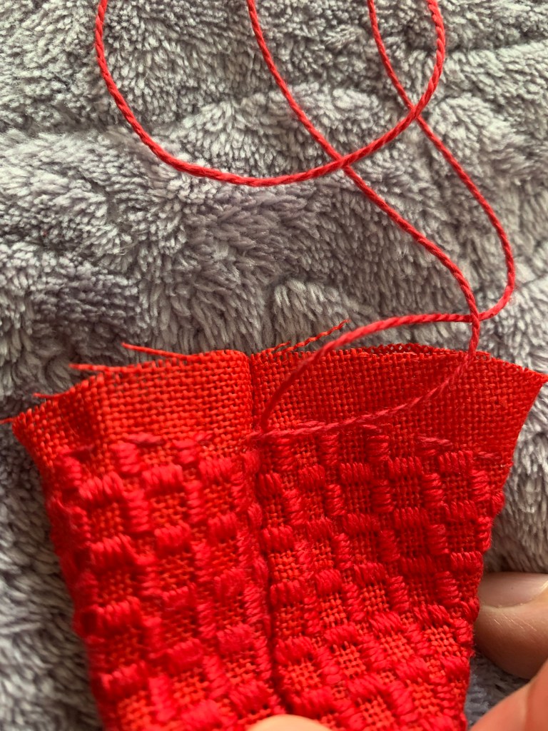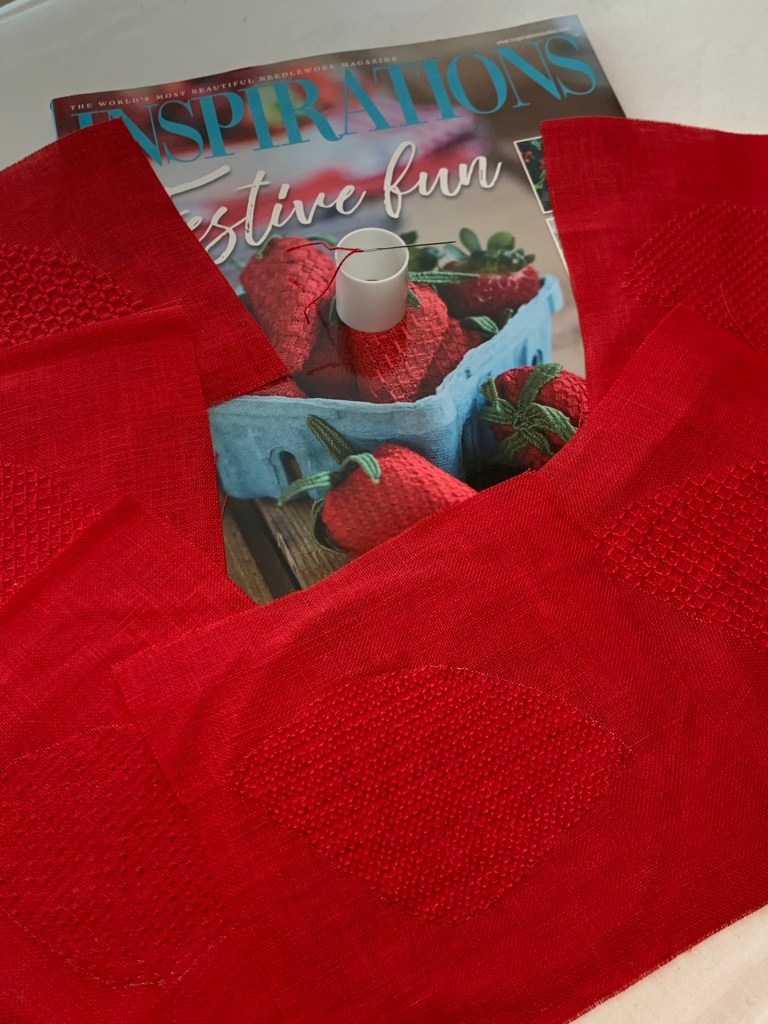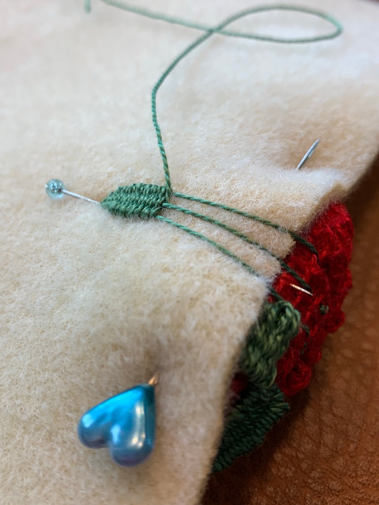 6 woven picot leaves were embroidered on the tops of each strawberry. My finishing diverged slightly from the instructions as provided in the magazine.