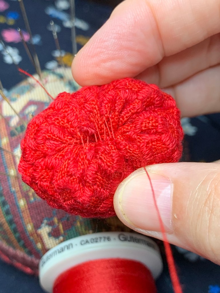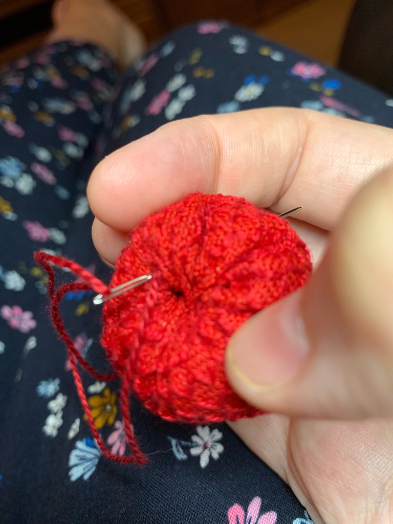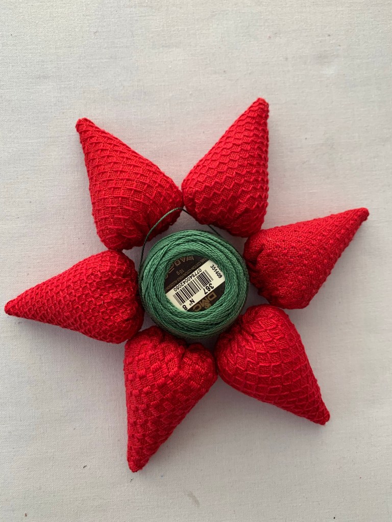 Using a large tapestry needle, bury the ends of the threads used to gather the top. Pull the thread tight before you snip. The end will pop into the strawberry and will not be visible. Using a matching thread (I used Gutermann) and a small needle, secure the opening and any exposed raw edges using a ladder stitch. Start by loosely stitching 4 or 5 stitches. Pull the stitches right, closing the gap and burying any raw edges. tie ends off and bury the ends into the strawberry. Found some nice green DMC perle 8 for the leaves