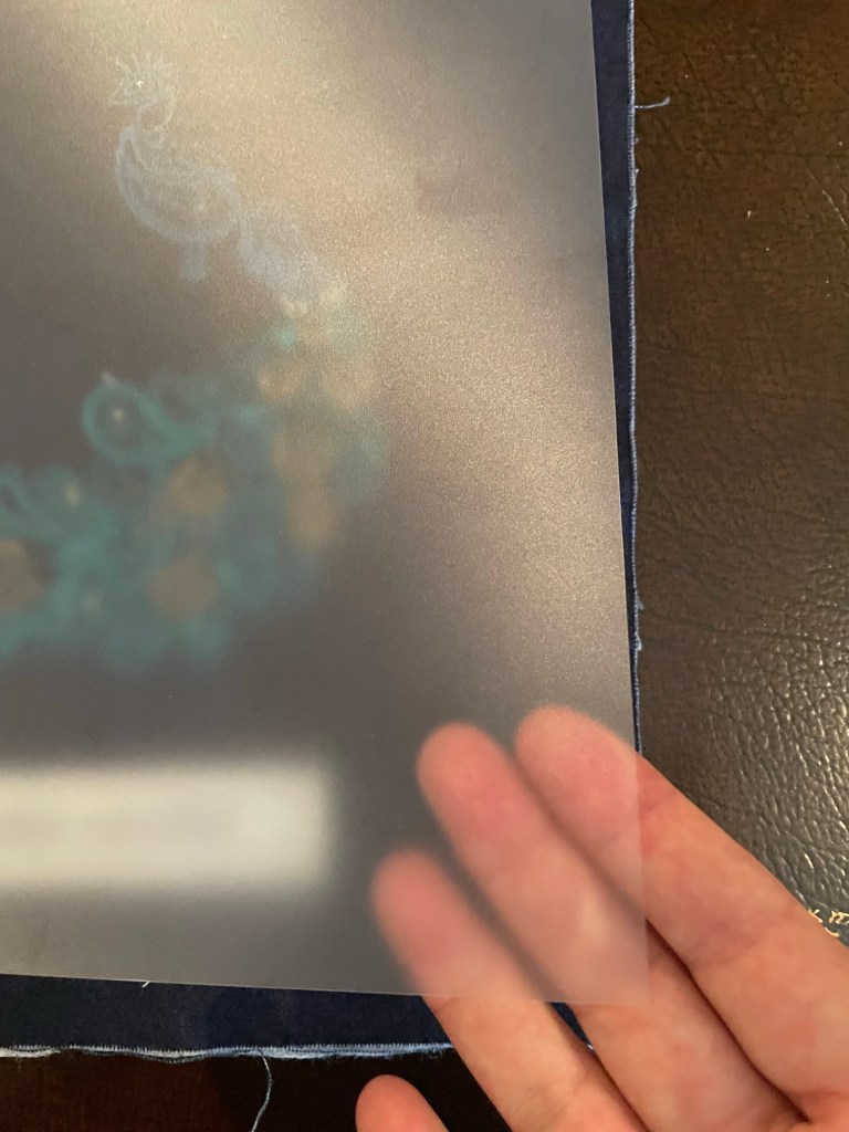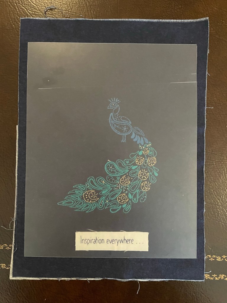 Not too big… or too small … My decision was driven by my desire to be able to print designs on fabric using my ink jet printer. Thus the maximum size of the pages could be 8 1/2″ by 11″ (a standard page of paper) that would fit in my printer. Allowances had to be made for raw edges, fraying, tack marks of pieces mounted to stretcher bars and the trimming that would have to come when each page was finished. The fabric pieces also had to be large enough so that they could be placed in an embroidery hoop.